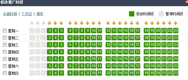 下圖中,灰色代表廣告暫停時段,綠色代表投放。投放時段一般根據業(yè)務運營需要設置,如客服下班則廣告下線。也會根據分時段的轉化率設置。如游戲、交友業(yè)務,工作時間暫停,休息時間投放。