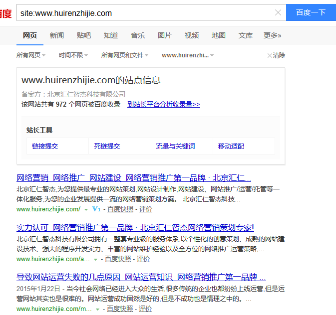site是SEO中的一個(gè)語(yǔ)法, 通過(guò)site網(wǎng)址,在課本里我們通過(guò)site可以看到網(wǎng)站是否被降權(quán)。具體的操作是這樣的的,打開(kāi)瀏覽器,在百度的輸入框中輸入site:你的網(wǎng)址。讓后我們就可以看到一串的數(shù)據(jù),一下以匯仁智杰網(wǎng)絡(luò)推廣的網(wǎng)站為例。