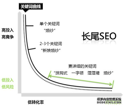對于一般小型網(wǎng)站,目標關(guān)鍵詞帶來的流量占網(wǎng)站總搜索流量的絕大部分。存在于網(wǎng)站目錄頁、內(nèi)容頁的關(guān)鍵詞也會帶來流量,但為數(shù)不多。網(wǎng)站上非目標關(guān)鍵詞但也可以帶來搜索流量的關(guān)鍵詞,稱為長尾關(guān)鍵詞。