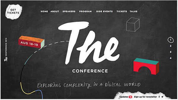 1、網站標題“The conference”利用白色為主,在黑色背景的襯托下格外顯眼,不同的字體搭配,以及不同的大小排布,極具沖擊力,整體帶個人以活潑富有活力的頁面感。