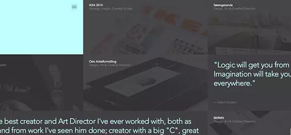 Jan Finnesand用了全屏的寬度與高度來放置方塊,每一塊都有特殊作用,大多展示了他以往的項(xiàng)目案例。充滿整個(gè)瀏覽器窗口的方塊造就了一件非常酷的設(shè)計(jì)。