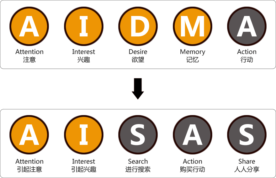 如今是互聯網當道的時代,如何幫助網民獲得更大的利益成為了很多公司的主旨,傳統的AIDMA法則越來越不能滿足現在的發展趨勢,新的AISAS法則應運而生,那么AIDMA法則轉變為AISAS法則究竟有什么變化,我們通過下圖來簡單了解一下